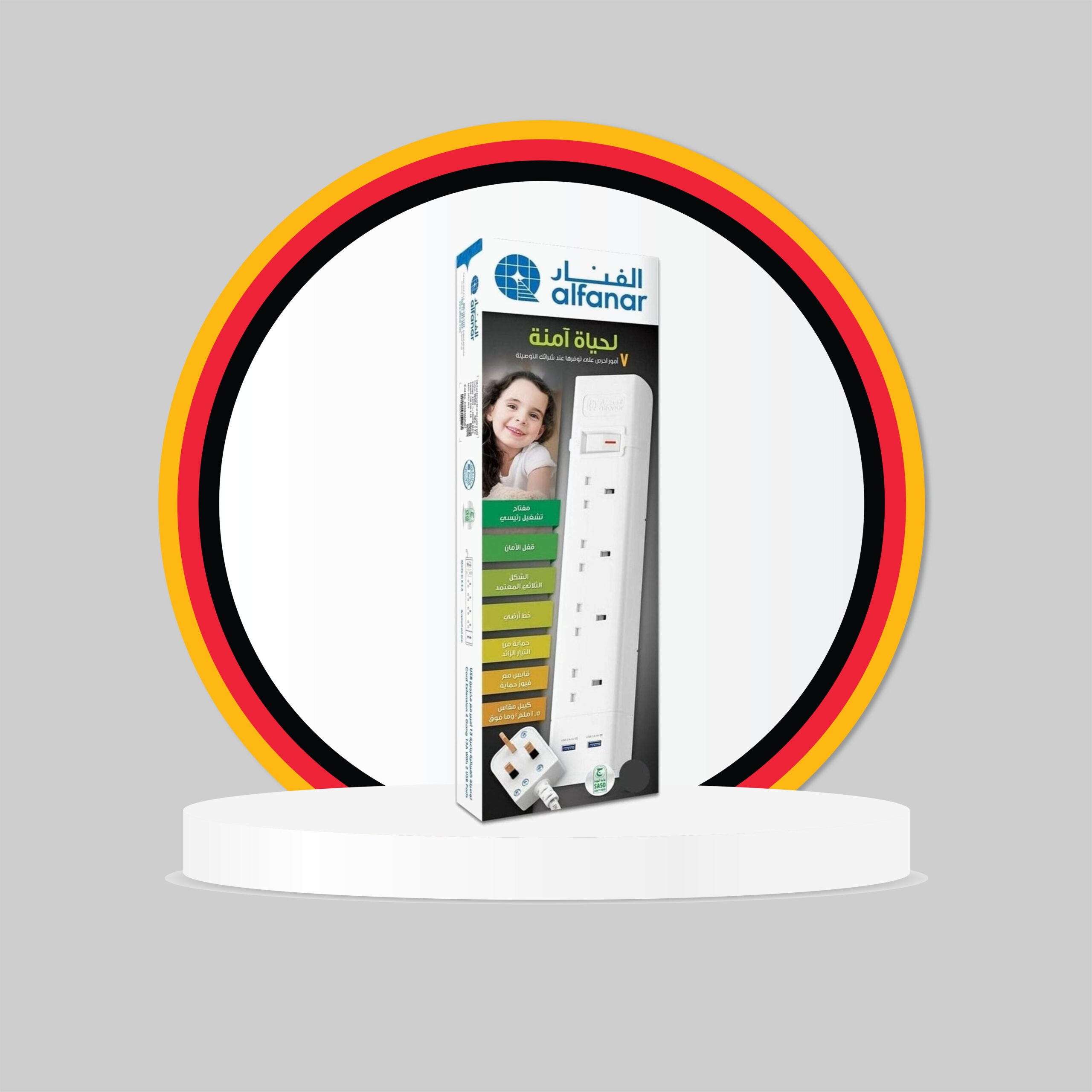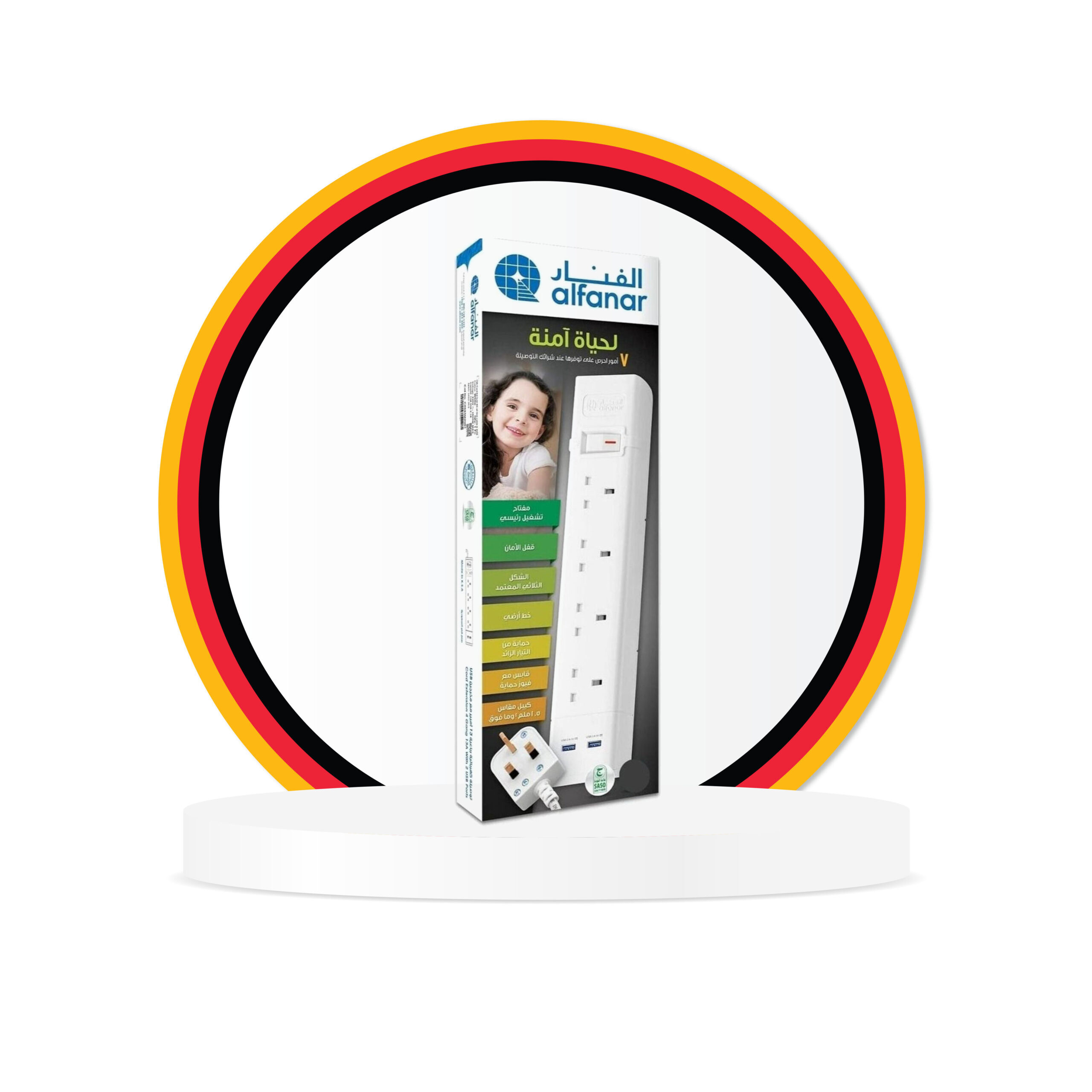 وصلة طاقة بـ 4 مقابس و منفذين USB للشحن السريع كيبلات 1.5 ملم طول 5 متر ، قابس قوة 13 امبير مع زر حماية من الحمل الز ائد لسلامتكم ⚡ صناعة سعودية بجودة عالية – أمان معتمد للحماية من المخاطر الكهربائية . ضمان سريع إلى باب منزلك الرقم المجاني للض